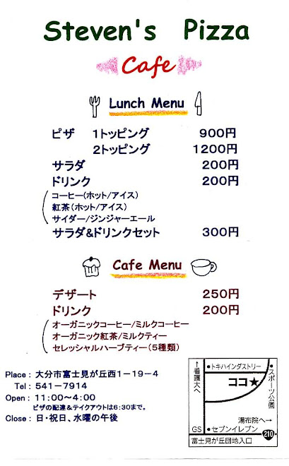 Steven's Pizza Cafe is located 8 km southwest of downtown Oita, just off route 210. From Fujimigaoka's Tokiwa Industries department store, head west till you come to a small park. Turn right. Soon, the pizza shop will be on the right. (See the map below on the menu.)